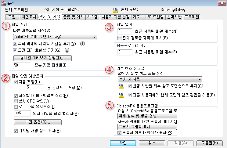 이번 시간은 Auto CAD 옵션 [환경설정_열기 및 저장] 설정을 설명합니다.