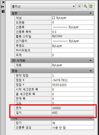 4. 아래와 같이 특성창에 면적 및 총 길이를 확인 할 수 있음.