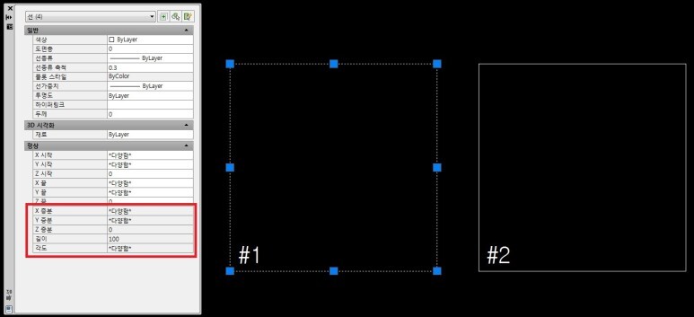 ◆ 2번 사각형은 REC 혹은 폴리선 으로 이루어진 정 사각형 (100x100) : 객체 = 1개