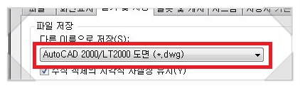 (2) 옵션 대화상자에 좌측 위에 있는 다른 이름으로 저장 에서 2000/LT2000 도면 설정 가능.