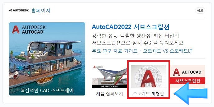 2. 우측 하단 오토캐드 체험판 클릭하면 무료체험판으로 이동. (무료 체험판 다운로드 클릭)