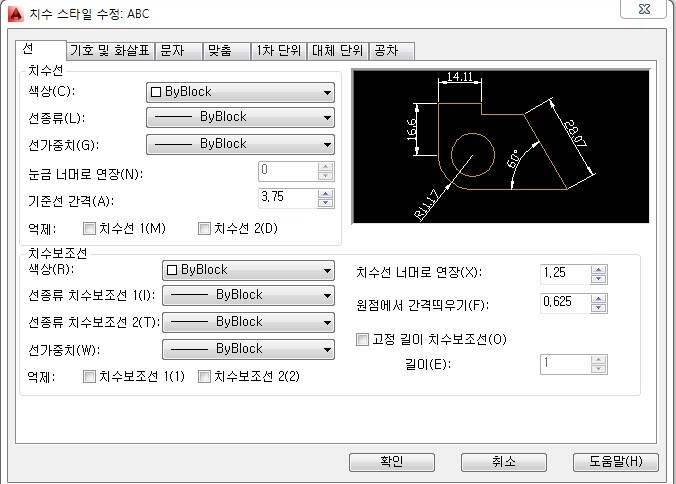 그럼 치수 스타일 관리자에서 [선 (치수선, 치수보조선)] 를 설정 해 보겠습니다.
