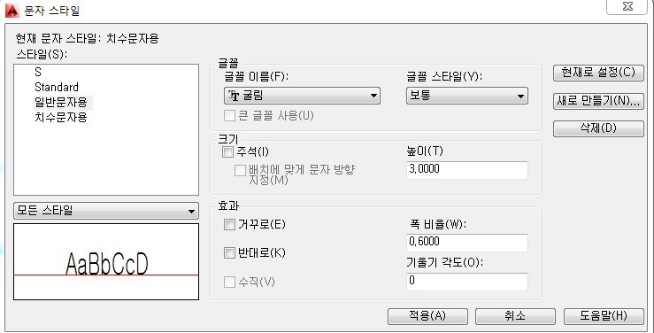 ※ 문자 모양: 문자 스타일(Y) : (우측 화살표 클릭) 문자 스타일 선택