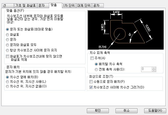 ※ 맞춤 옵션 : 치수보조선 사이에서 사용 가능한 공간을 기준으로 문자 및 화살촉의 배치 설정