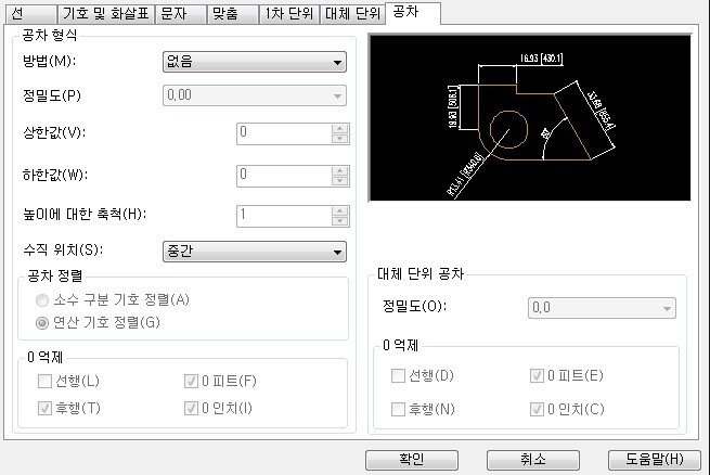 공차 방법 없음을 적용 시 (공차정렬, 0억제, 대체단위공차) 설정이 필요 없습니다.